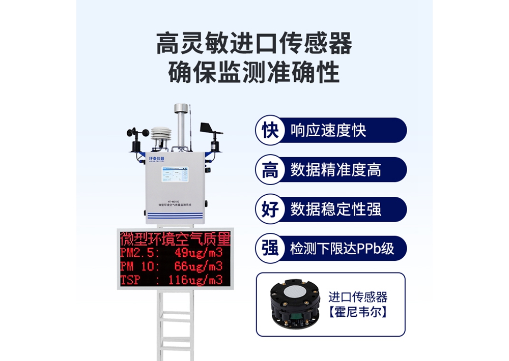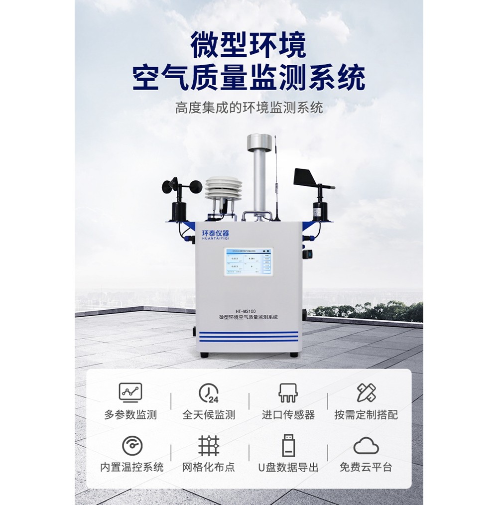 HT-MS100 微型環(huán)境空氣質(zhì)量監測系統可以全天候、連續、自動(dòng)地監測環(huán)境空氣氣態(tài)污染物(S0?、NO?、CO、O?、TVOC)和環(huán)境空氣顆粒物(PM2.5、PM10、TSP) 等的實(shí)時(shí)變化情況,迅速、準確的收集、處理監測數據,實(shí)現區域空氣質(zhì)量的在線(xiàn)自動(dòng)監測。